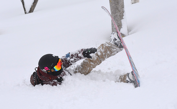 深い雪で転倒した際、ひと苦労するのが立ち上がること。ボードが雪に埋もれて身動きがとれなくなり、手をついても埋まって支えられません。パウダーで埋まったときは、立ち上がるコツがあります。
