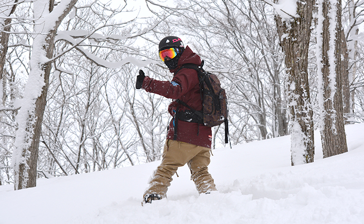 バックパックを背負うと、いざというとき背中を守るプロテクターとしても役立ちます。荷物も持ち運べるので、ツリーランなどナチュラルバーンを滑る際は持参がおすすめです。