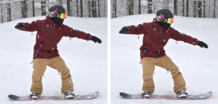 左の写真が通常のポジション。ボードのセンターに重心があり、一般コースを滑るときはこのポジションです。パウダーランでは右の写真のように腰を後ろに引き、重心が後ろになるよう乗ります。