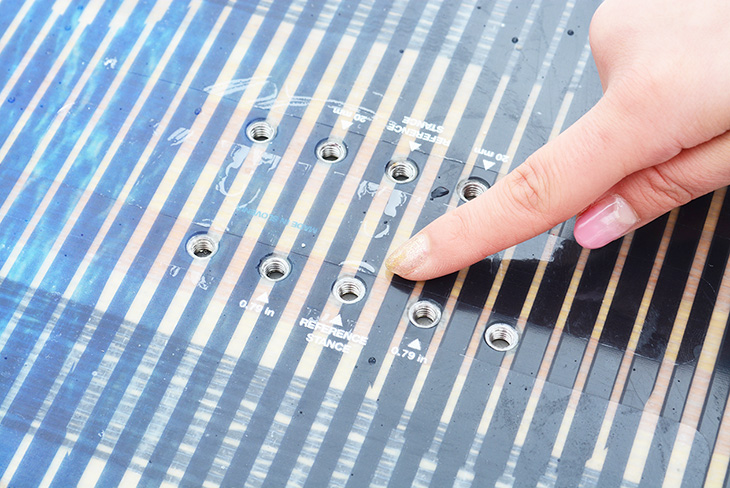 スタンス幅は左右のビンディングを装着する間隔のこと。ボードに足を置いたときの両足間の距離です。一般的には肩幅ぐらいがちょうどよいとされています。メジャーを活用すると取りつけ位置が明確です。
