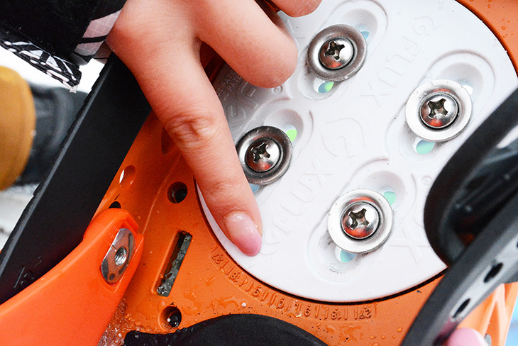 ディスクプレートの後ろの穴にビスを入れて取り付けると、ビンディングがつま先よりになり、カカトのはみ出しを解消できます。