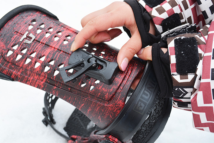 ストラップの長さも調整できます。ストラップをつなぐビスなどの取り付け位置を変えて長めや短めにし、フィット感を調整できます。また、ヒールカップのビスの位置を変えて、バインディング全体のフィット感を広げたり縮めたりすることもできます。