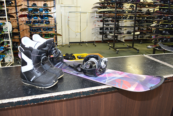 ウエアのほかに、必要なのがスノーボードとブーツのセット。これらはスキー場のレンタルコーナーで借りられます。単品のレンタルと、ウエアと用具がセットになったお得なレンタル料金も用意されています。