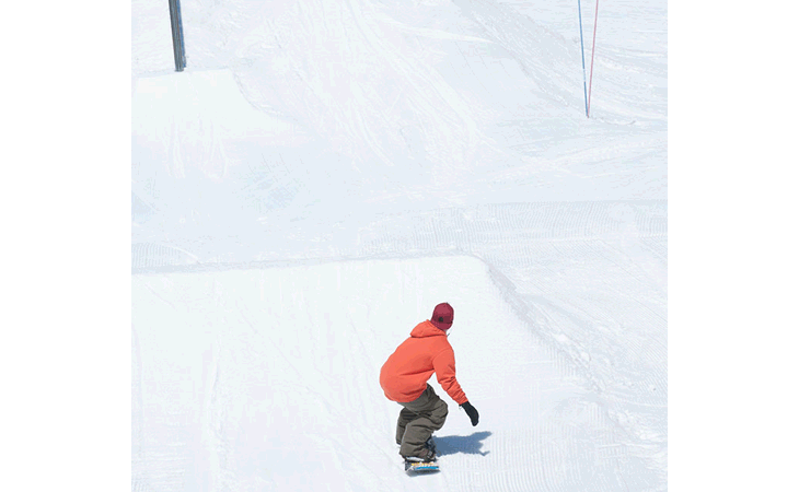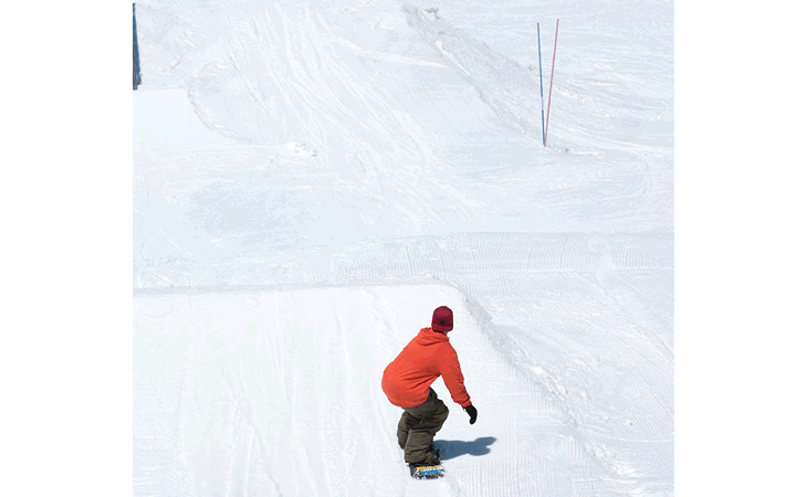 ワクワク感を楽しめるようなら、低い姿勢を意識しながらアプローチ。離陸ではジャンプのタイミングに合わせながら、軽く伸び上がってみよう。大切なのは、スノーボードを身体に引き寄せることを意識できるかどうか。きちんと意識できるようになるまで、次のステップには進まない方がいい。急がば回れ、なのだ。
