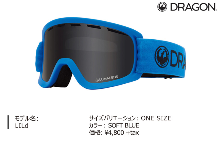 ジャパンルーマレンズなど高い技術力を誇るカリフォルニア発の老舗アイウェアブランドDRAGONが提供するキッズ向け製品、LILd(リルディー)は3歳頃~7歳頃におススメのサイズ。大人用のゴーグルと同じ製法を採用し、高い機能性・耐久性と本格的なプロダクトデザインが特徴だ。なんと最新技術LUMALENSのダークスモークレンズを採用し、曇天~晴天まで幅広い天候で使用できる。