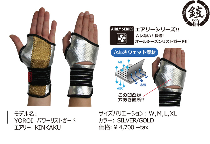スノーボーダーに特に多いのが、手首の怪我。緩斜面でも、油断は大敵。リストガードをしておけば、かなりの衝撃を軽減できます。YOROIのリストガードなら、ウエットスーツ素材のボディで、適度な伸縮性と無数の通気口で蒸れにくく快適。手首内側のバーが、適度にしなり動きやすく、安全。このKINKAKUモデルは、旬のシルバーカラーと京都産金銀糸をリスト部に使用した威風堂々の輝き。スケボーなどでも使えます。