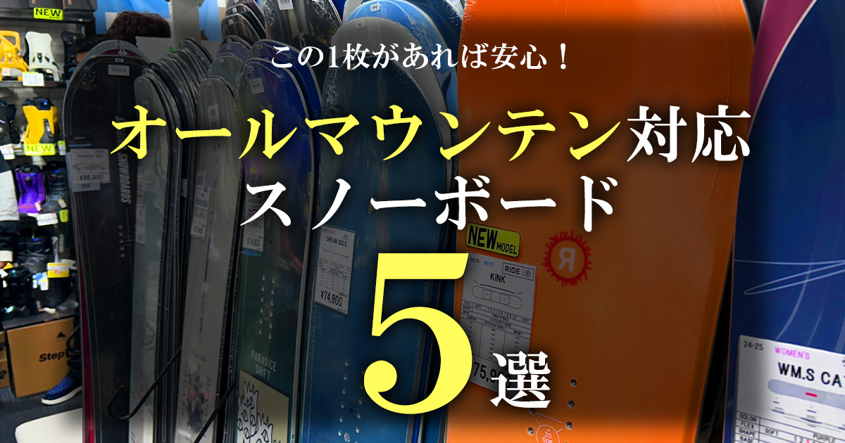 今回は、そんなオールマウンテンを滑るのに最適なボードをご紹介。 急斜面やボコボコ、アイシーなバーン、パウダー、春のシャバ雪、さらには地形の変化など、どんな状況にも対応できるコントロール性とタフさを兼ね備えたものがベスト。ややしっかりとしたフレックスでノーズが長めに設定されたたディレクショナルボードが操作性が良くオオスメ。ただしスイッチ性能を損なわないよう、極端なテール形状は避けた方が無難だ。 最強の相棒となるオールマウンテンボードとともに、雪山全体で最高のターンを描こう!