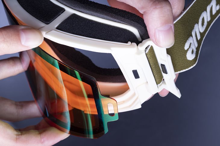 Anonゴーグルの魅力はマグネット。モデルによって数は変わるが、フレームとレンズの双方にマグネットが埋め込まれているので、滑走中に外れたりする心配はまったく無用。フレームからレンズを外したり、装着する事がすごく簡単にできるので、気軽にレンズ交換や汚れを取ることができる。