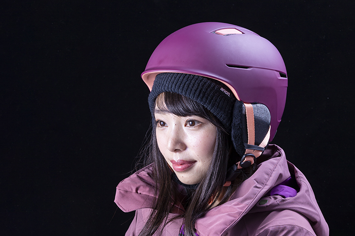 まずヘルメットはビーニーと違って、雪が降っていても濡れないから暖かい。滑走中の安定を保つため、そして万一の事故の時に頭部を守るためにも、フィット感はとても大事だ。また、Anonのゴーグルとのマッチングがいいので「おでこ」が出ない。おでこが出ていると見た目にかっこ悪いだけでなく冷たい風が隙間から入ってきてしまうのだ。