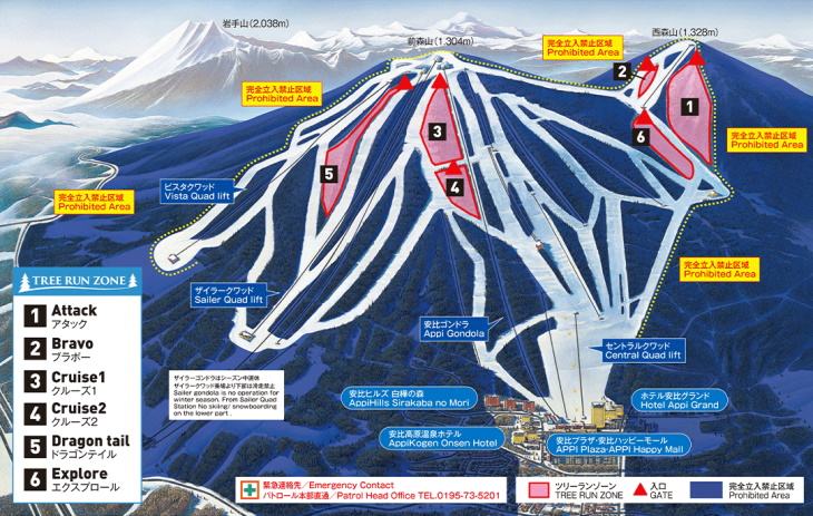 アタックは、安比の中でもさらに上質な雪が期待できる西森山エリアにあるが、ツリーランエリアの中でも斜度が急だったり、雪が溜まりやすい沢地形があること、完全立入禁止区域の境界を越えてしまうとスキー場に戻ってこれなくなるなど、滑走レベルだけでなくツリーランの経験も必要になってくるので注意が必要。