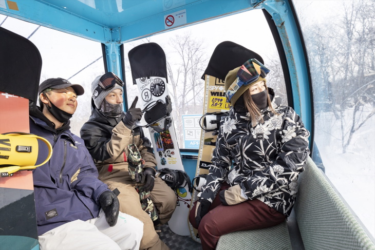 RUIは安比が初めて。AKANEはイベントで来たことがあるが、ほとんど滑っていないということで、松浦プロがゴンドラ内で安比の特徴や地形のポイントなどを簡単に説明。素晴らしい景色や、これから滑ることの期待で乗車時間が、あっという間に感じられるかもしれない。