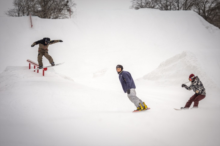 コースを流すだけでも楽しいが、コース脇のカベ(斜面)や段差、地形を使いながら、飛んだりコスったり遊べるポイントを探しながら、滑っていくのも安比流の楽しみ方だ。