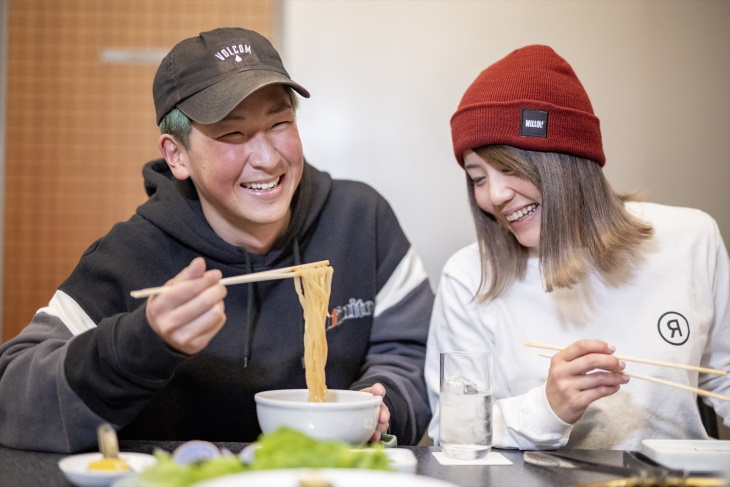 李朝苑の総料理長が自信を持っておすすめしているのが「盛岡冷麺」。RUIも「ヤバい!」を連発。この絶品の冷麺はお土産用もあるので、帰ってからも楽しめる。