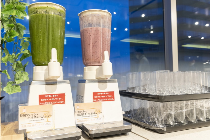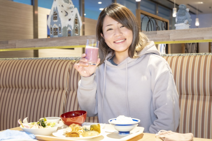 朝食はバイキングが人気。なかでも女性を中心に好評なのが安比のスムージー。安比高原牧場の新鮮な乳製品、地場の新鮮野菜をふんだんに使用。。AKANEは「一口飲んだだけで、なんか眠っていた身体が喜んで起きてくれて、元気がチャージされたような気がした(笑)」と笑顔に。