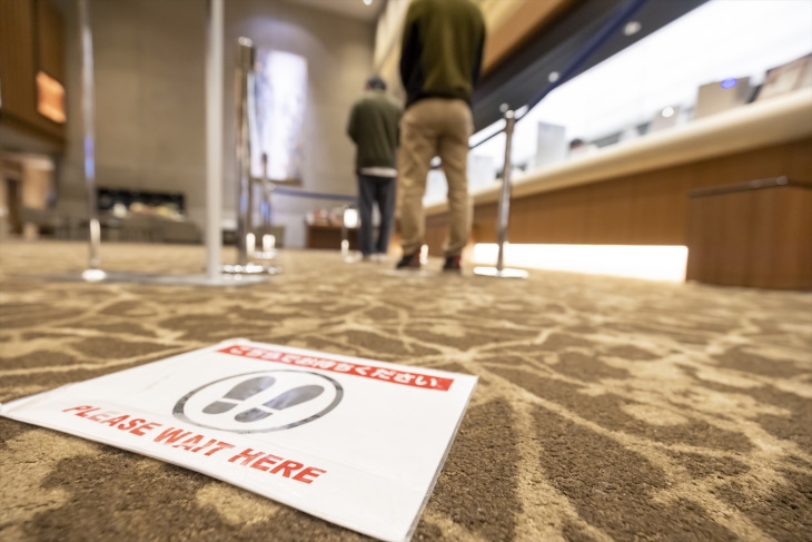 チェックインやチェックアウトなどでフロントに並ばなければならない状況でも、自然にソーシャルディスタンスを保てるように床に表示が置いてある。