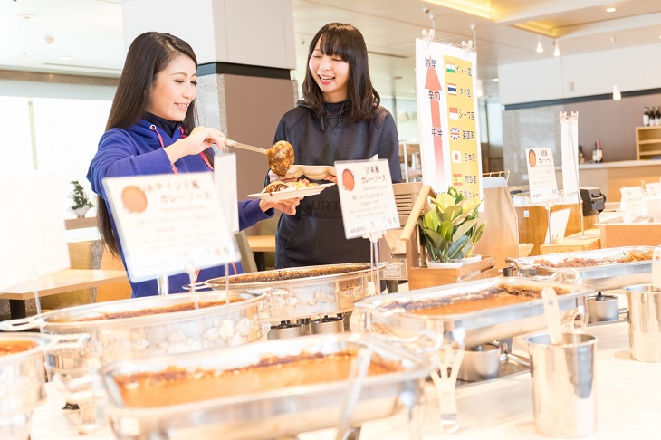 カレーはホテル・シェフこだわりの日本風、英国風、ジャワ風など6種類のルーを用意。好みのルーをどれか選んで食べてもいいし、6種類全部の味や辛さを食べ比べてみるのもいい。ご飯だけでなくナンもあるし、ハンバーグやカツ、エビフライなどのトッピングにサラダやドリンクバー、デザートにはフルーツやアイスクリームまで、好きなモノを好きなだけ食べることができるのだ。
