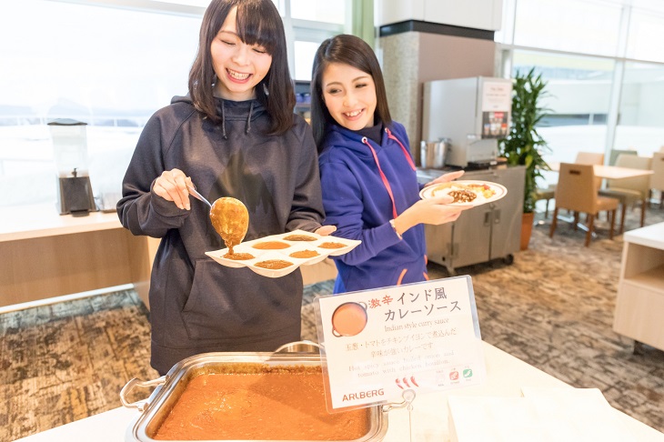 ホテルに到着後、すぐに滑りたい人ももちろんいるだろうが、腹ぺこのふたりはランチを選択(笑)。ホテル内にあるテラスレストラン「アルベルク」では、人気の「カレー&パスタバイキング」をランチタイムに開催。6種類のカレーや3種類のソースを用意したパスタ、そして焼きたてのピザなどがすべて食べ放題。