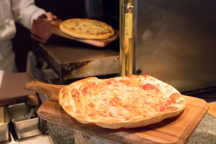 釜から取り出したばかりの、できたての熱々のピザが食べられる。ピザの種類はミックスピザとマルゲリータで、どちらも絶品!