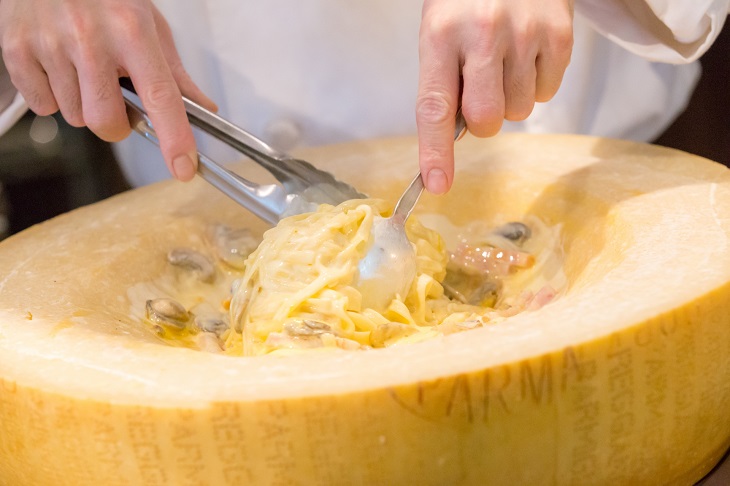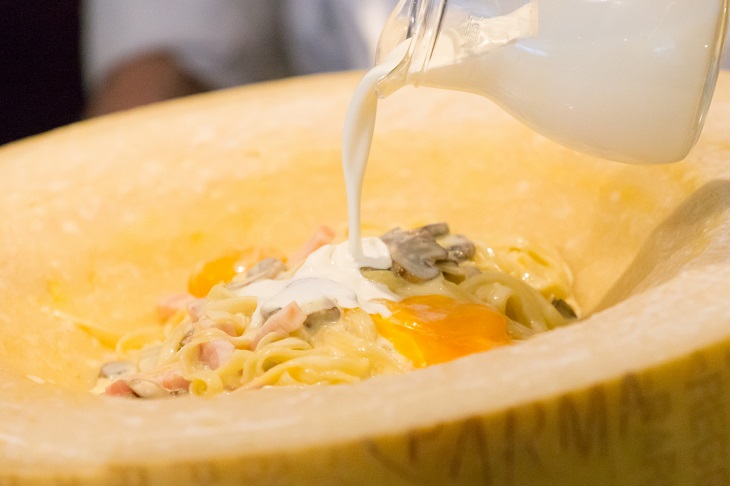 そして今季大人気なパスタが、シェフが目の前でパルミジャーノチーズの上で仕上げるカルボナーラだ。ホテル隣にある安比高原牧場の牛乳を使用し、塩加減が絶妙のパンチェッタ、そして仕上げのパルミジャーノのチーズがほどよく混ざりあい、なんとも言えない奥の深い味と香りが楽しめる。もちろん、このパスタも食べ放題!