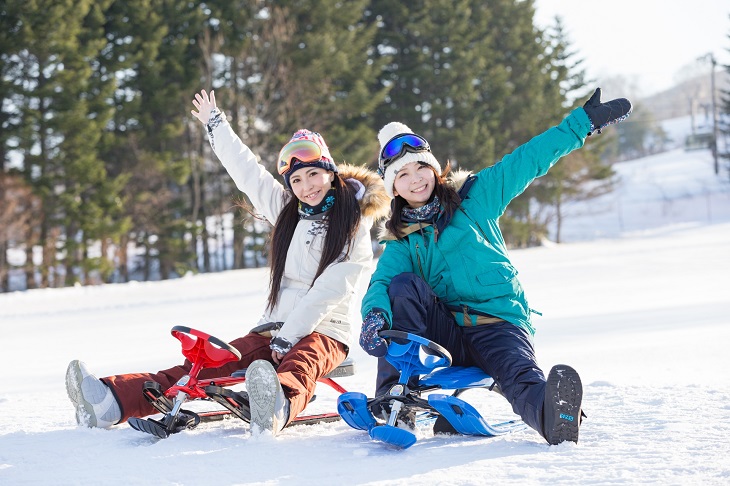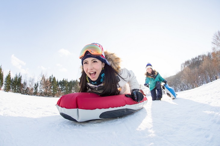 おなかいっぱいになって大満足のふたりはレンタルに向かって「滑る準備」。と、なるはずだったが、ホテルの前にある「APPIハッピースノーパーク」で遊んでいる子供たちの姿が見え、思わず「楽しそう!私たちも、遊びたい」とスタッフにダメ元で聞いてみると、大人でもOKとのこと。少し食事に時間が掛かったこともあり、ふたりはスノーパークで遊ぶことにした。