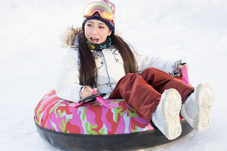 チュービングに絶叫するカスミ。「思ったよりスピードが出て、楽しい!」とリピート。