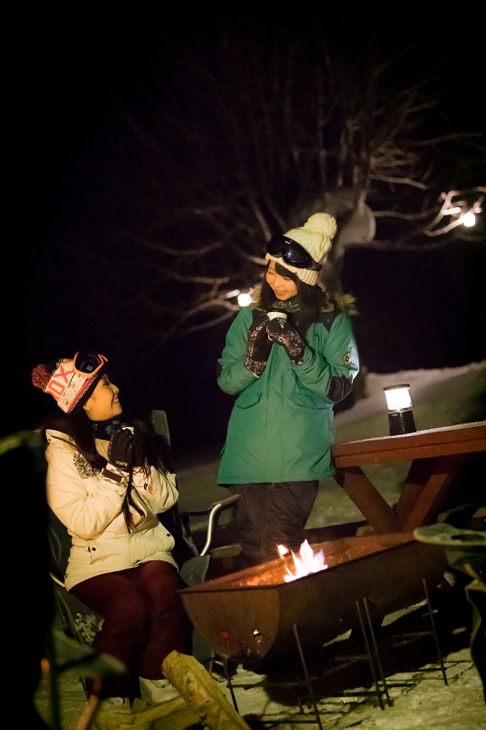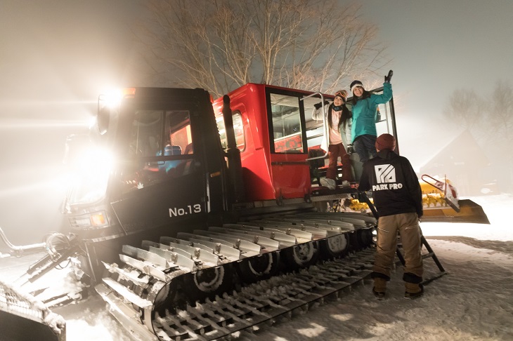 夜になると、ふたりは「星空キャットツアー」に参加。雪上車で真っ暗な雪原を移動して、満天の星を眺めることができるツアーだ。キャビン付きの雪上車なので移動中も暖かくて快適。観賞ポイントでは焚き火を囲み、温かなコーンスープで暖を取りながら、ガイドが簡単な星空の話をしてくれる。