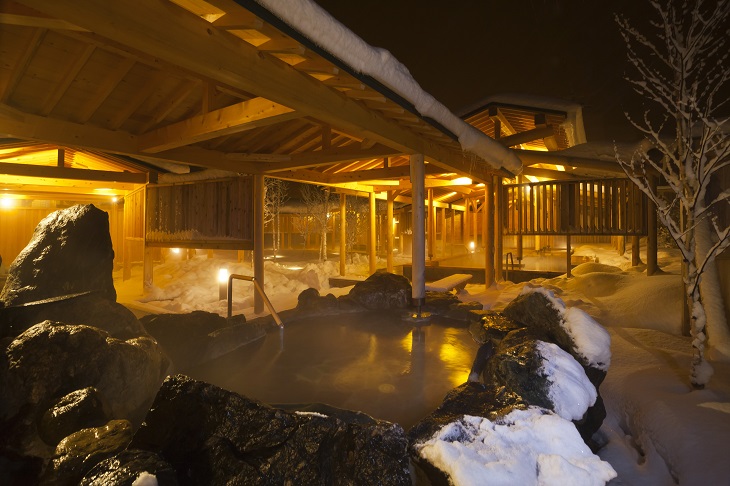 ツアーから戻ったふたりは冷えた身体を温めようと、安比温泉「白樺の湯」へ。昨年7月に新登場の露天風呂はとっても広々。内風呂でしっかり温まってからがおすすめだ。通常は、タオル付きで大人1200円だがホテル宿泊者は特別料金で利用できる。