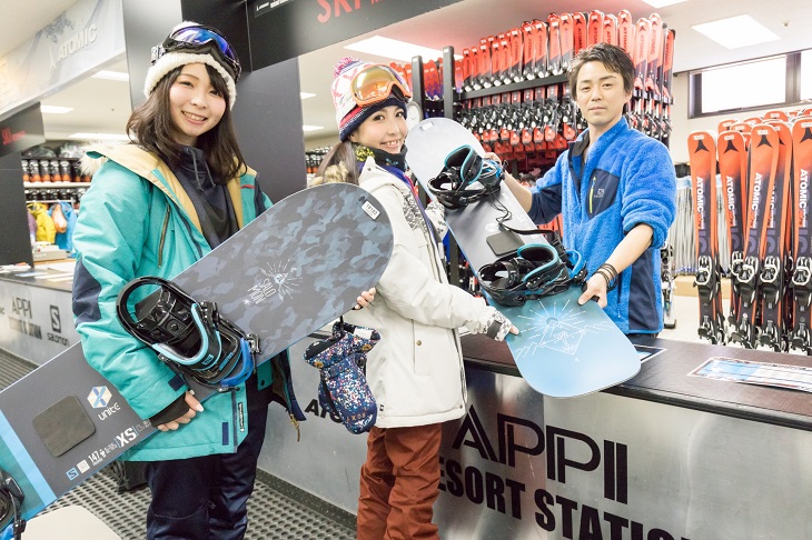 移動のことを考えると自分の用具を持ってくるのがちょっと大変と思う人も、安比はレンタルが充実しているので手ぶらでも大丈夫。安比プラザにある「サロモン&アトミックコラボステーション」ではボードからウエア、小物アクセサリーまでレンタルを用意している。朝食後、カスミはボードを単品で、ミホはボードとブーツのをセットをレンタル。
