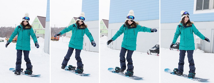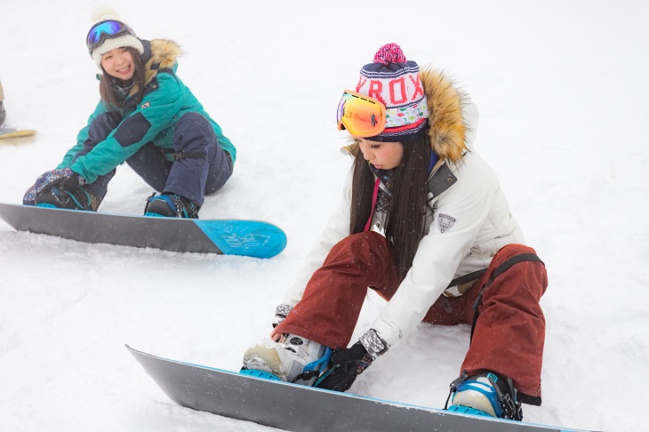「ミホに教えるのがちょっと面倒くさいというか(笑)、間違ったことを教えてしまうのも悪いので、先生にお任せしちゃいました〜!」(カスミ)。室内でブーツのフィッティングをし、外ではボードの持ち方から指導。ミホと一緒にカスミもこっそり確認(笑)。