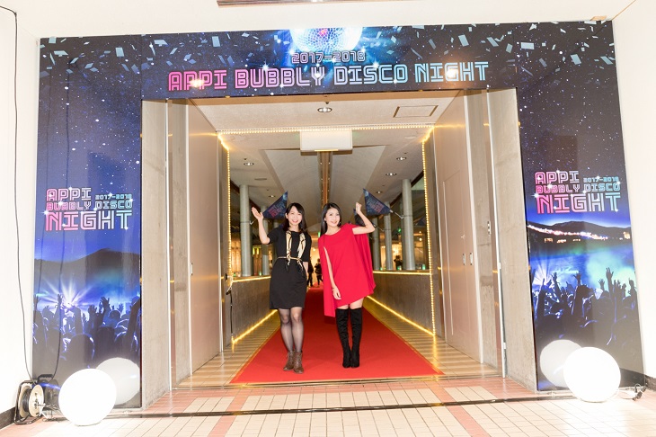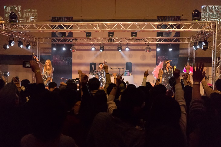 ゲレンデをたっぷりと滑った後は、カスミの今回の一番の目的とでも言える「APPI BUBBLY DISCO NIGHT 2017-2018」のイベント会場へ。このイベントは、簡単に説明すると「1980年〜1990年代のバブルの時代に多くの人が楽しんでいた空間を再現し、昼間は思い切り滑りを楽しんで、夜も思い切り遊んじゃおう!」と、言うもの。カスミのお目当てはスペシャルゲストとして登場する「MAX」だ。