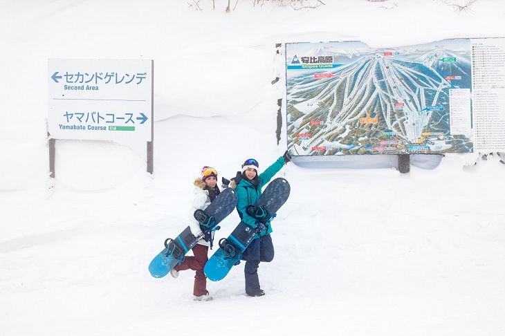 前日の滑走や夜のイベントの疲れも見せず、ふたりはゴンドラで山頂へ。ヤマバトコースはミホのような初級者や子供でも気軽にトライできる初級コースながら、そのまま白樺コースへ向かってベースまで滑りきれば、約5キロのロングランが楽しめるのだ!