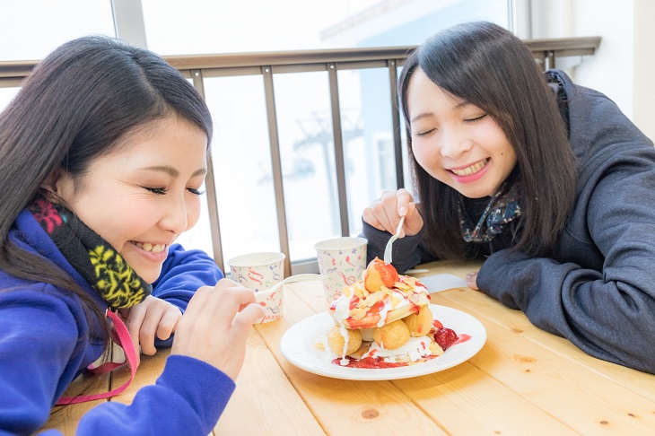 そんなふたりが、(前の写真で)やる気を見せる前に、実はゴンドラ山頂駅にある「天空カフェ・パノラマ」でしか食べられないスイーツ「メリーゴーランド(アソートベリー)」を堪能。朝食をしっかり食べて来た後にも関わらず……。「見ないでぇ〜、見逃してぇ〜、見なかったことにしてくださ〜い(笑)」と言いながら、あっという間にペロリ。