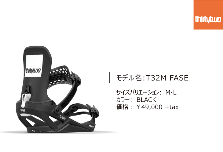 2ストラップビンディングのフィーリングをそのままに、脱着のしやすさを向上させたモデル。ビンディングを脱ぐ際に従来であれば2つのストラップを外す必要があるが、このモデルは足首部分のストラップを緩めるだけで脱ぐことができる。最新のFASEシステムを搭載した、THITYTWOが初めてリリースするビンディング。