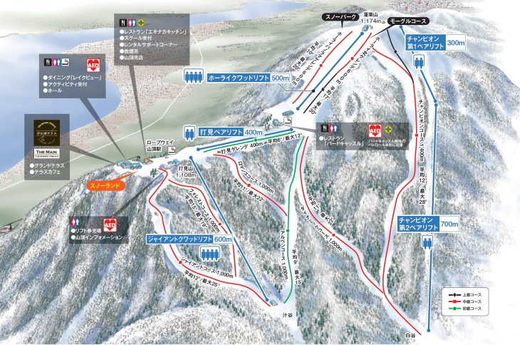 びわ湖テラスにはオールシーズン国内外から多くの人々が訪れるが、せっかく冬に出かけるならスキー場も楽しみたい。ロープウェイを降りたらすぐにスキー場が広がり、そのままリフトに乗らずに緩やかな斜面を滑り出せるので、ビギナーにもやさしいのがポイント。ゲレンデは打見山から蓬莱山という2つの山の幅広い稜線上にあり、そこからバラエティに富んだ数本のコースが西側の尾根や谷を下っている。コースは初中級者向けが中心だが、パーク・モーグルコース・ツリーラン・自然地形なども楽しめ、全レベルで楽しめるオールラウンドな懐の深さが魅力だ。
