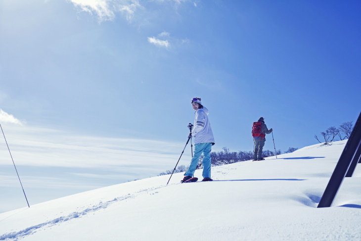 静かな冬山をじっくり堪能するのなら、スノーシュー体験。スノーシューを履いて山の中を一歩踏み込んで探検してみよう。スノーシューが初めてでもガイドが丁寧にレクチャーし案内してくれるから安心だ。90分の体験はちょっと体を動かすのにもちょうどよく、滑れない人でも雪山の魅力を存分に味わうことができる。