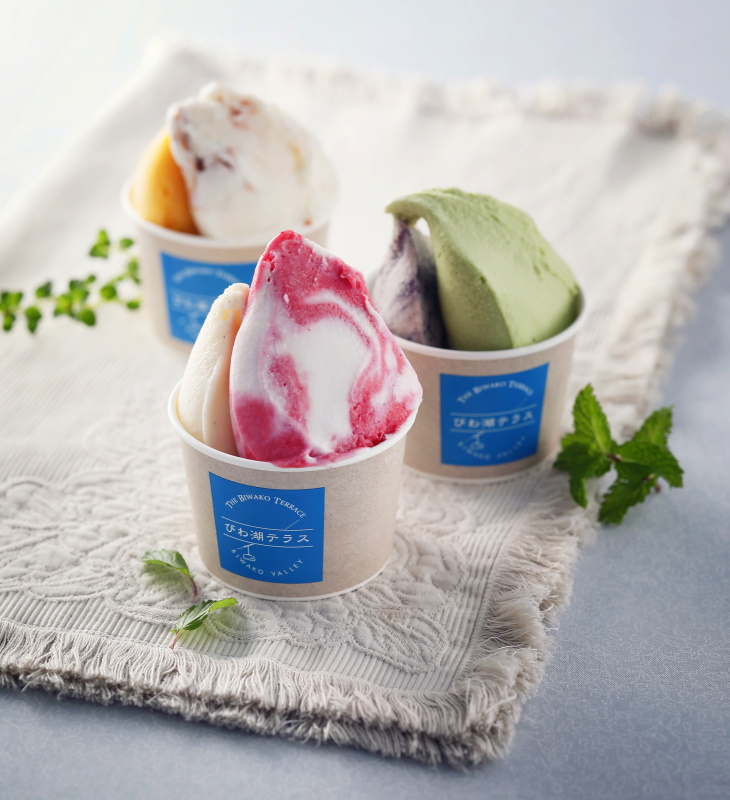 テラスカフェの一押しメニューは、ポルペッティとアルペンマカロニ。ヨーロッパアルプス地方の料理を親しみやすくアレンジした味わい深いランチ。また、オリジナルジェラートは地元牧場の搾りたて牛乳で作った新鮮なミルクジェラートや、「滋賀県土山茶」の豊潤な味わいが特徴の「近江和紅茶ジェラート」など、全7種類の味が楽しめる。