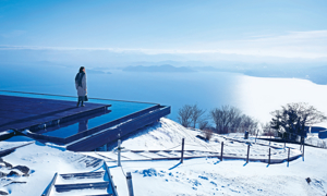 琵琶湖西岸の山麓にある駐車場から「びわ湖テラス」やスキー場がある山の上まで、まずはロープウェイに乗り込んで向かう。全面ガラス張りのロープウェイからは、天気がよければ京都市内はもちろん、大阪市内のビル群までの絶景が! そして麓から約5分、標高1100 m の山頂に着けば、そこには一面雪に覆われた白銀の世界と、圧倒的なスケールと迫力を誇る琵琶湖の眺望が広がっている。
