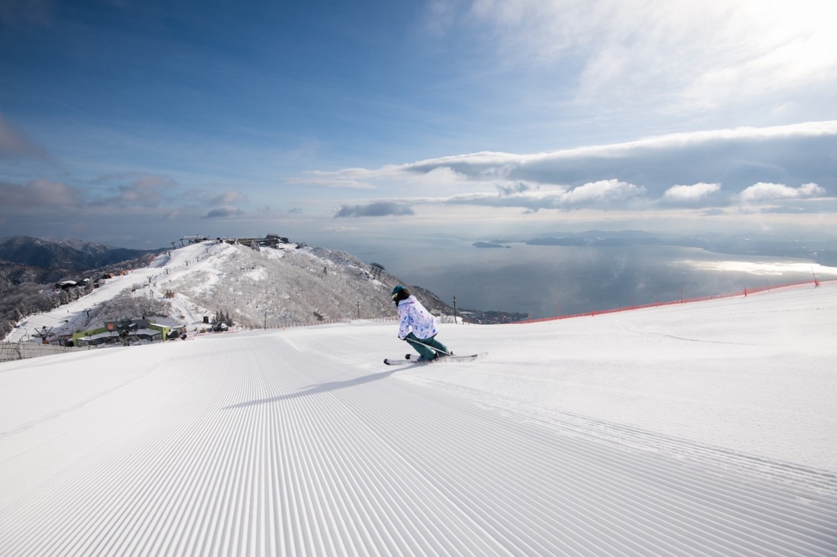 日本中にさまざまな魅力あるスキー場が存在するなかで、雄大なびわ湖を見渡しながら絶景のなか滑る爽快感はここでしか味わえない体験。びわ湖を眺めながら滑るホーライパノラマゲレンデは、平均斜度10度の中級コースなので、滑ることに慣れてきたら誰でもその景観とともにライディングを堪能できる。ぜひここだけの非日常的世界を楽しんでほしい。