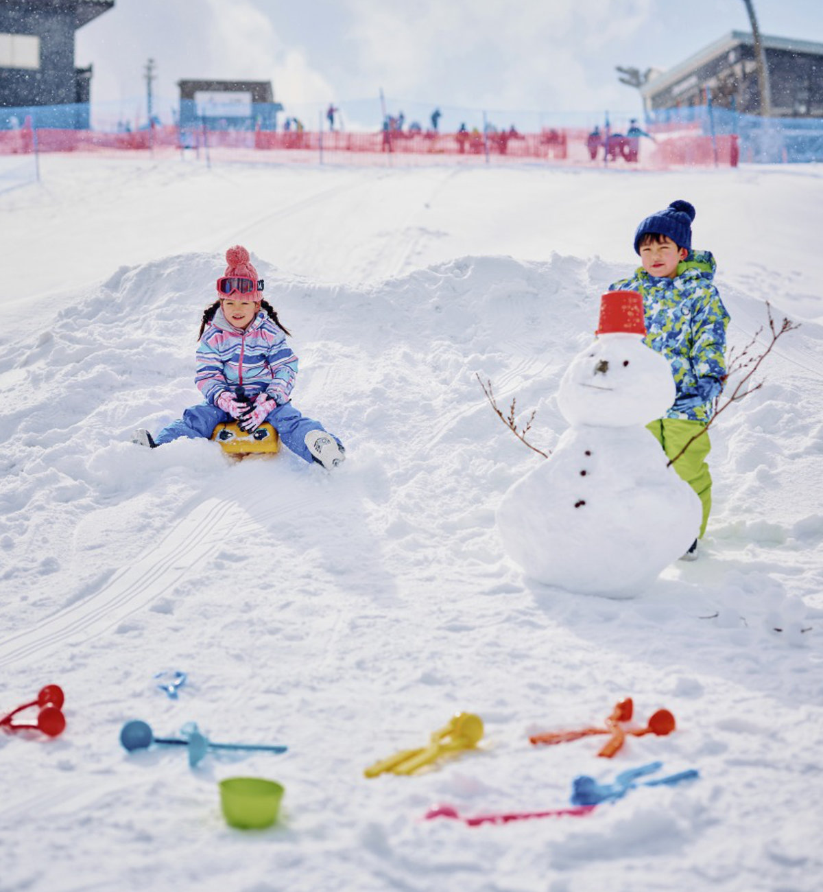 山頂駅に隣接する「スノーランド」は小さな子連れに大人気。スキーやスノーボードはしなくとも、自由に遊べるソリや雪遊び道具があるので、子どもも大人も思わず夢中に! 普段はなかなか雪に馴染みがない子どもにとっては、雪とトモダチになる最高のチャンス。
