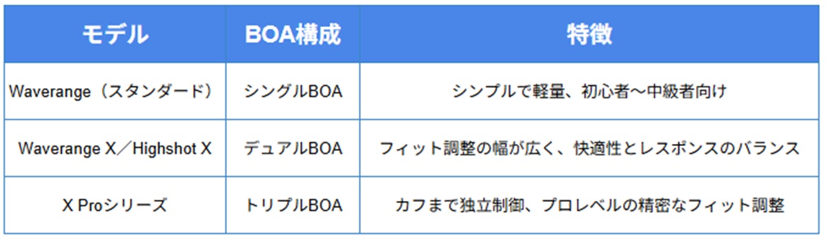 デュアルBOA採用のXシリーズは、上達を狙いたい脱・初心者を目指す初中級者や、自分のライディングスタイルが確立している上級者にもオススメできる。