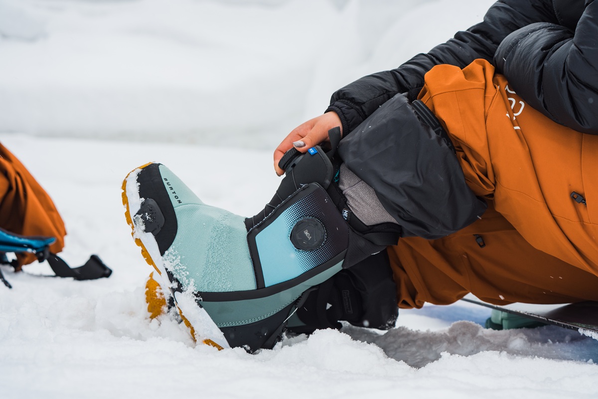 ブーツの締め加減の好みには個人差があるが、上部をしっかり締めることで、ボードのエッジ切り替え時などに素早い反応を得られ、下部を適度に締めると、足裏感覚を残しつつ柔軟な操作ができるようになる。また、BOAなら均一な締め付けができるため、足の一点に圧が集中しづらいので疲れづらいというメリットも。長時間滑っても血流が悪くなりにくく、疲労が軽減されやすい。