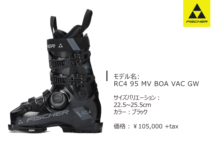 多くのスキーヤーが履きやすいミッドボリューム(MV)の幅100㎜シェル。フレックスは110で、男性の中級者に幅広く対応。「バキュームフィットシステム」はフィッシャー独自のシェル熱成型方法で、広げるだけでなく狭くすることも可能で、オーダーメイドのような優れたフィット感を手に入れることができる。BOA®フィットシステムを搭載し、ロアシェルの両サイドから足を均一に包み込むホールドで、ナチュラルな均一感とシェルとの一体感が得られる。シェルが足全体と精密にフィットすることでパワー伝達性も向上する。