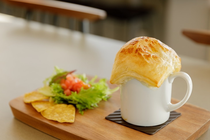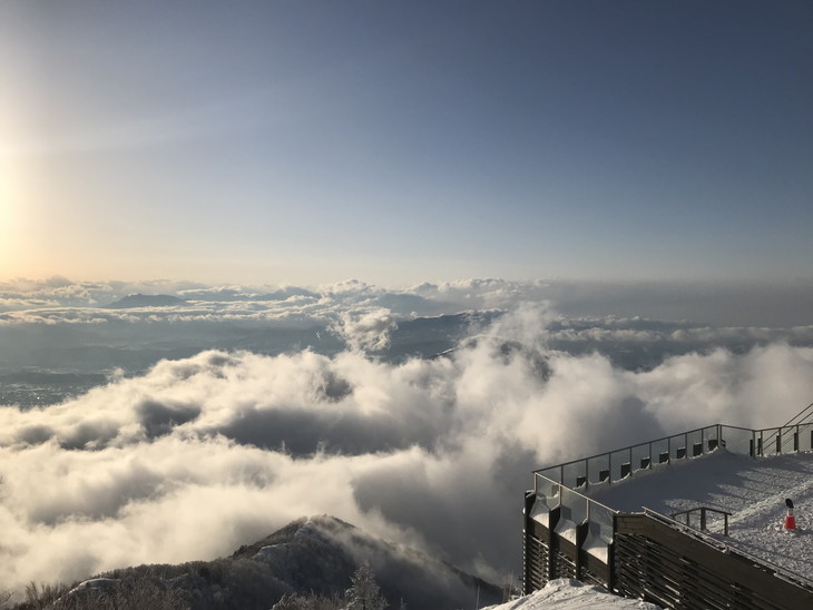 ロープウェイ山頂駅にある「SORA terrace(ソラテラス)」は遠くの山々まで一望できる絶景スポット。条件に恵まれると眼下に雲海やうつくしいサンセットを見ることができる。併設する「SORA terrace cafe(ソラテラスカフェ)」は暖炉やカフェバーが備えられ、景色を見ながらこだわりのコーヒーや「雲海パイ包みスープ」を楽しめる。