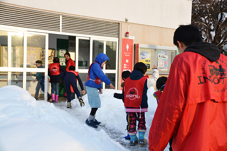食後のちょっとした休憩に雪遊びがはじまった。雪の上を転げ回ったり雪合戦をしたり、この時ばかりはみんなおおはしゃぎ。どこでも元気に遊び回る子どもたちを、複数の専任スタッフが常に見守っている。子どもと楽しくおしゃべりしたり一緒に遊んだり、ときにはたしなめたり。寒くないか、トイレは大丈夫かと、みんなが心地よく過ごせるように気を配ってくれる。