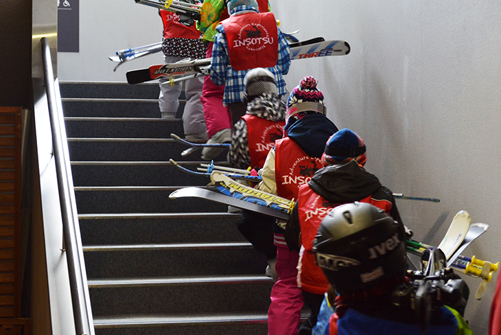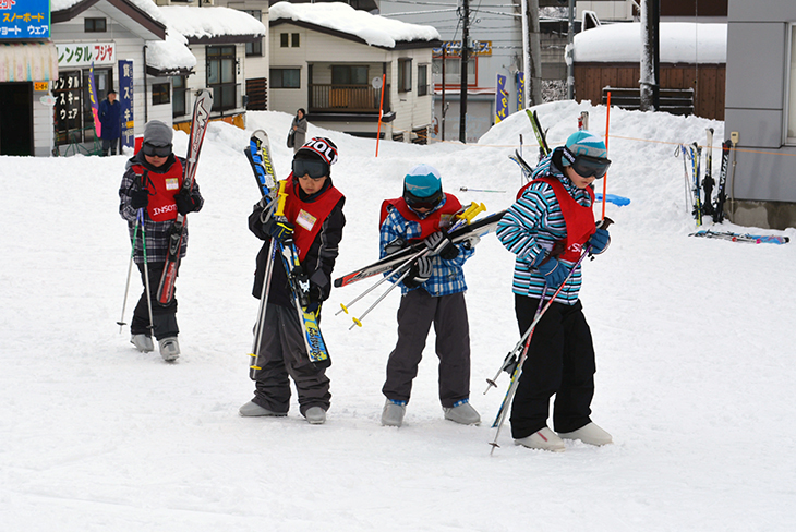 スキー場に着いたら各自でウェアに着替えてブーツを履く。小さな子どもやスキーに不慣れな子どもはスタッフが身支度を手伝い、ウェアやブーツがきちんと着用できているか最後にきちんとチェックしてくれる。準備ができたら、スキーを持っていよいよゲレンデへ。重いスキーブーツでゆっくり歩きながら、途中でスキーがバラけても両手でしっかりと抱え、ちゃんと自分の用具は自分で運ぶ。