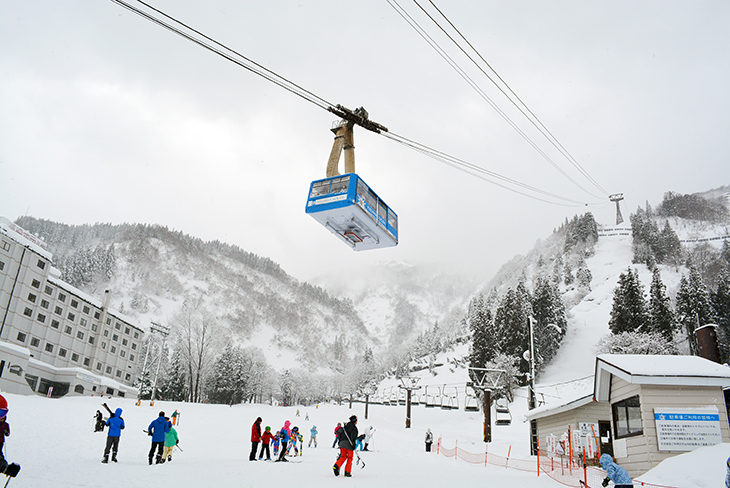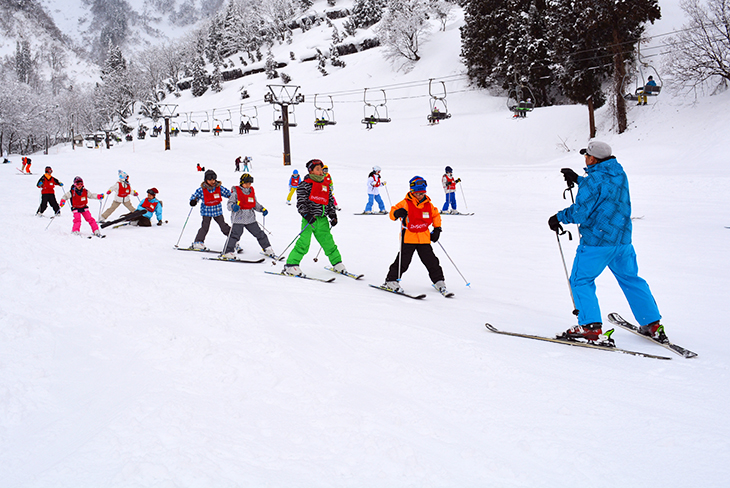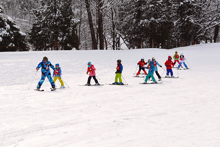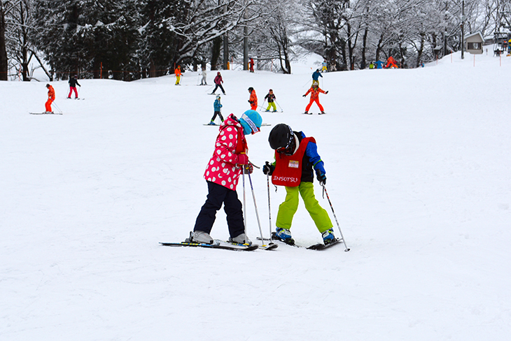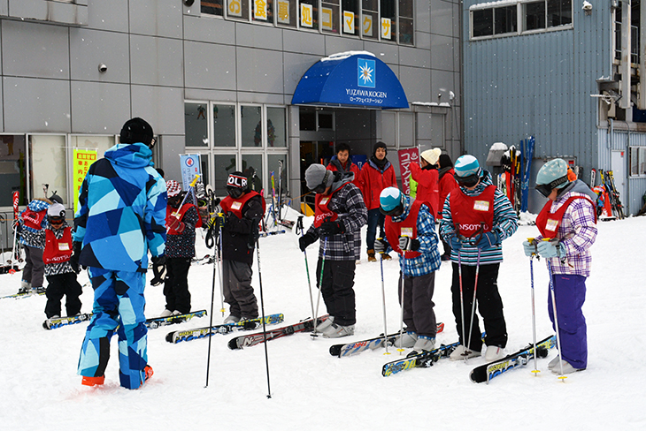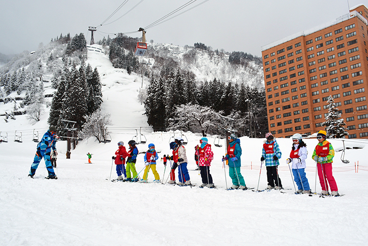 湯沢高原スキー場は166人乗りの大きなロープウェイを備え、山頂と山麓の2エリアにコースが広がる縦に長いゲレンデ。子どもたちは緩斜面の多い山麓エリアでスキーを楽しむ。スキーヤー限定のゆっくり滑れるコースでレッスンするので、安心して過ごせる。