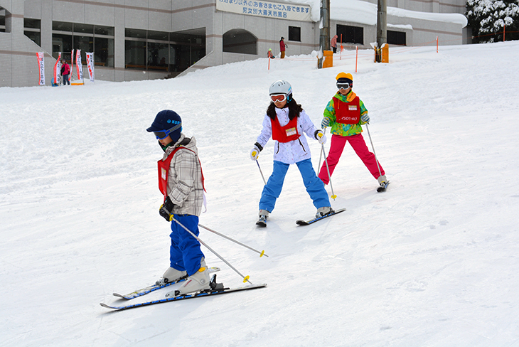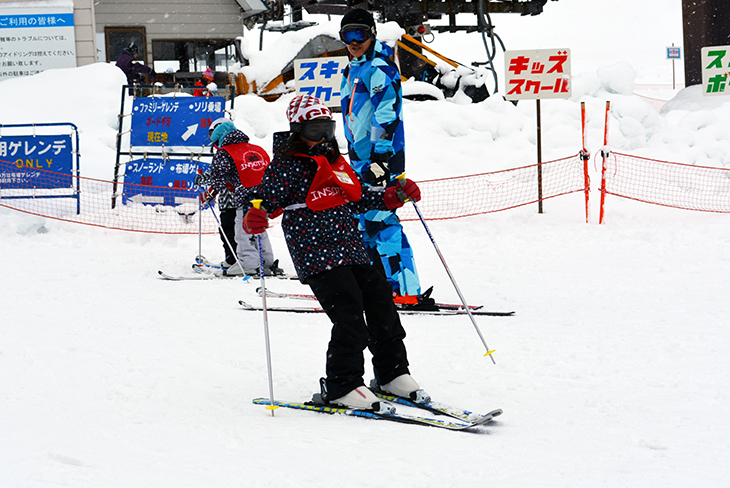 スキーが初めての子どもは、コース下の平坦な場所でスキーを履いて歩くことからチャレンジ。少し慣れたらプルークでまっすぐ滑る練習も。おっかなびっくりしながらだけど、ちゃんとスキーの扱いに慣れていく。