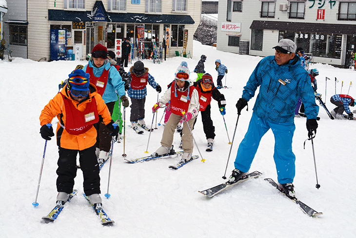 スピードの出にくい緩斜面でインストラクターと一緒に滑走。転んでしまってもちゃんと自分で立ち上がって列に戻る。バラバラだった隊列が滑るたびにきれいな一本のラインに整い、ぐんぐん上達していく過程が見ていてわかる。