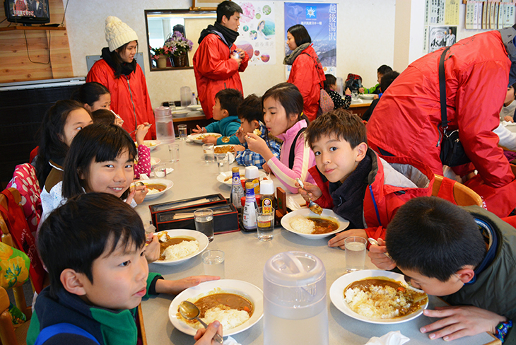お昼はゲレンデ内にあるレストランでスタッフと一緒にランチ。本日のメニューは子どもたちが大好きなカレーライス。たくさん滑ったから、みんなお腹がペコペコであっという間にたいらげてしまった。食事中も子どもたちのおしゃべりはとまらずとっても賑やか。