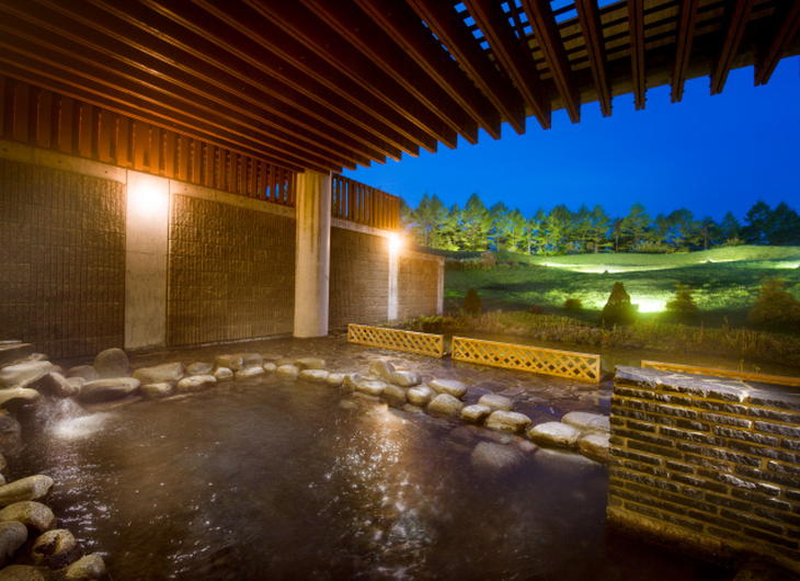 露天風呂も備える「相生の湯」は、今なお活動する浅間山の大地から湧き出る天然温泉。